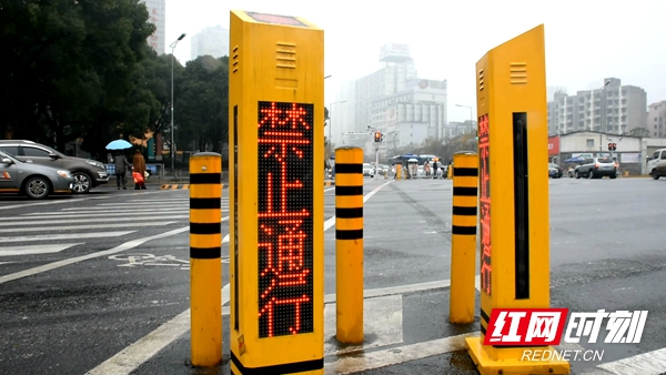 12月23日,记者再次来到韶山北路城南路口,路口人来人往,川流不息。路口斑马线两端黄色的小桩子格外醒目,这便是带有显示屏的语音提示桩,当与之对应的斑马线为红灯时,提示桩上则用红色的字滚动显示“禁止通行”;为绿灯时,则用绿色的字滚动显示“安全通行”字样。