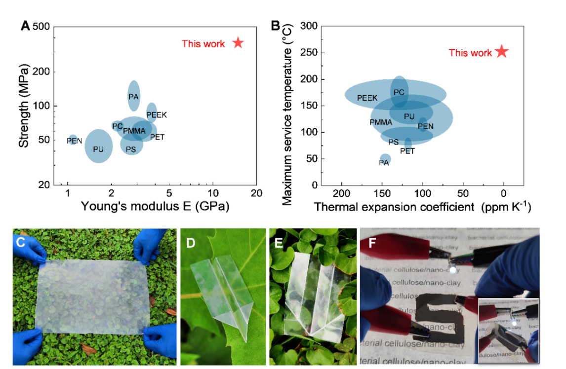 研究人员表示,这种仿生薄膜材料集成了优异的光学、力学和热学性能,并且在自然条件下可以完全生物降解,克服了废弃塑料难以降解的问题,在满足柔性电子器件基底材料光学透明性、柔性、低成本以及高低温下的尺寸稳定性等要求的同时,全生命周期绿色无污染,在未来柔性电子器件领域将具有广泛的应用前景。