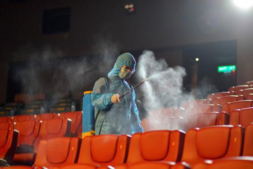 马来西亚政府已允许电影院等场所恢复营业。图为吉隆坡一家电影院的工作人员为放映厅消毒。图片来源:新华社发(张纹综摄)